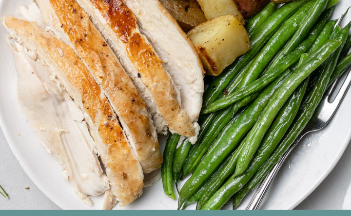 Enjoy a healthy version of Sunday roast chicken dinner in only 40 minutes. And save big by carving up three roasted chicken breasts for four people (it’s plenty). If you buy a four-pack, roast the fourth breast and set aside to add to a green salad or soup later in the week.